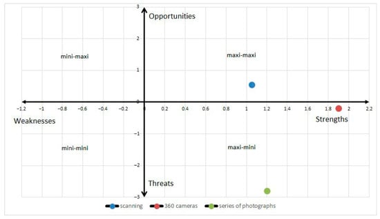 The graph in Figure 7 shows that only the laser scanning strategy fits into the ‘maxi-maxi’ strategy. For the other two strategies examined, a ‘maxi-mini’ strategy was identified. However, such a strategy, despite its advantages, has a higher application risk. Despite the high internal potential, there are a number of external risks, but this does not mean that such strategies should be completely abandoned.