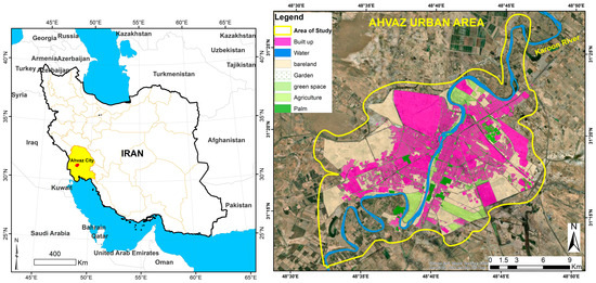 Ahvaz, the capital of Khuzestan Province, is located in southwestern Iran at 31°30′ N and 48°40′ E, and at an average elevation of 12 m on an alluvial plain (Figure 1). Ahvaz is divided into two halves by the Karun River, the largest and most water-rich river in Iran, and the city is classified as BWh (hot desert climate) in the Köppen-Geiger system. Maximum temperatures frequently exceed 45 °C in the hot mountains, with recorded highs near 53 °C [32]. The average annual rainfall is less than 250 mm. The most precipitation occurs in winter, while summers are generally rain-free. These unfavorable climate conditions, coupled with quickly expanding urbanization, widespread impervious surfaces, and very limited green infrastructure, have made the urban heat island (UHI) effect and thermal discomfort even worse. Besides the urban heat island effects, Ahvaz also has phenomenally unfavorable air quality as a result of dust and sandstorms that almost always come from southern Iraq and the Arabian Peninsula.