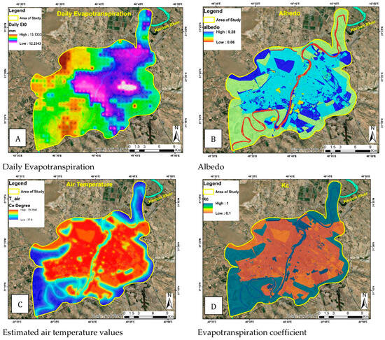 Figure 4. (A) Daily evapotranspiration; (B) albedo; (C) estimated air temperature values; (D) evapotranspiration coefficient.