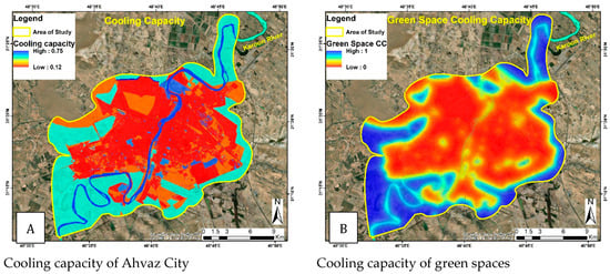 Figure 5. (A) Cooling capacity of Ahvaz City; (B) cooling capacity of green spaces.