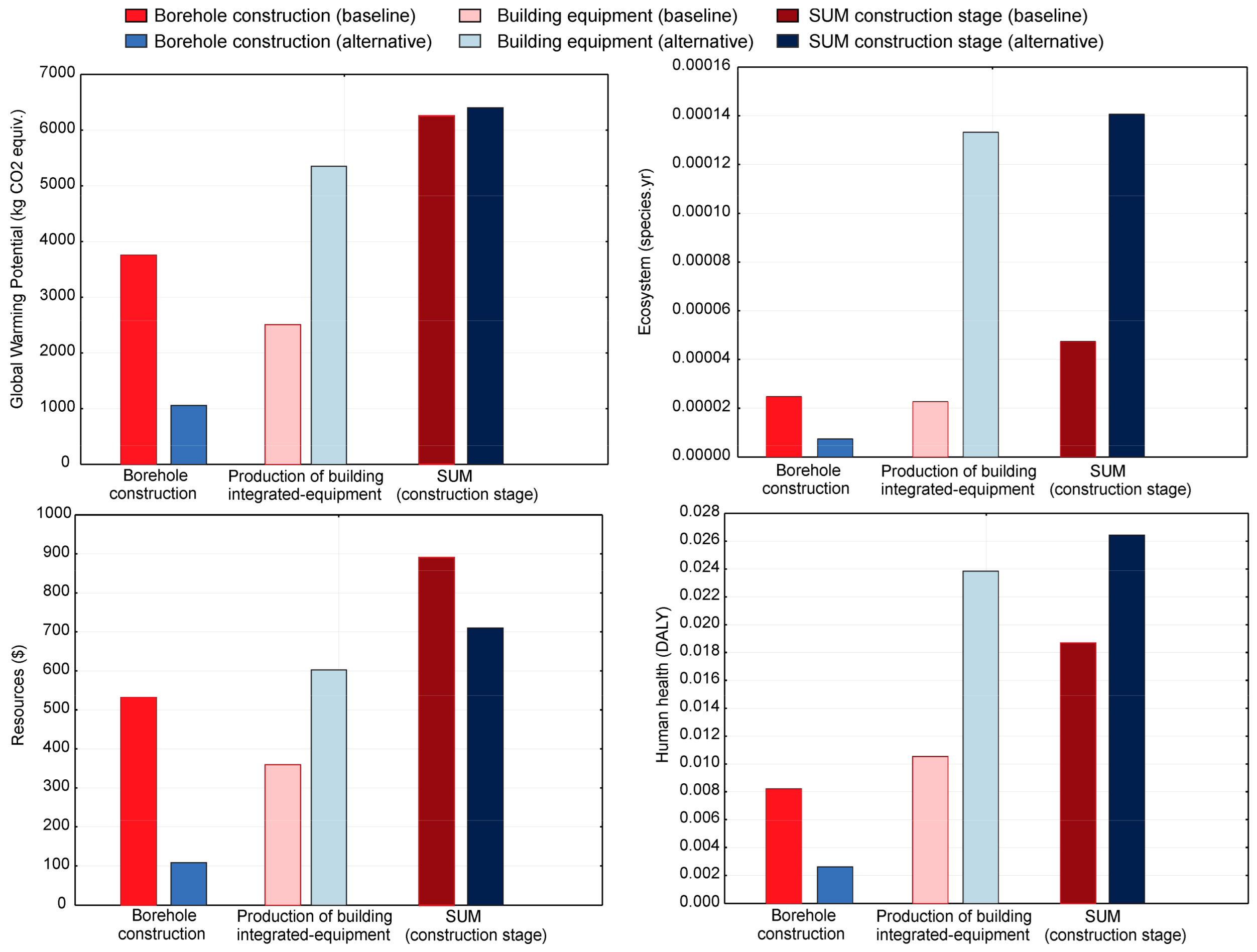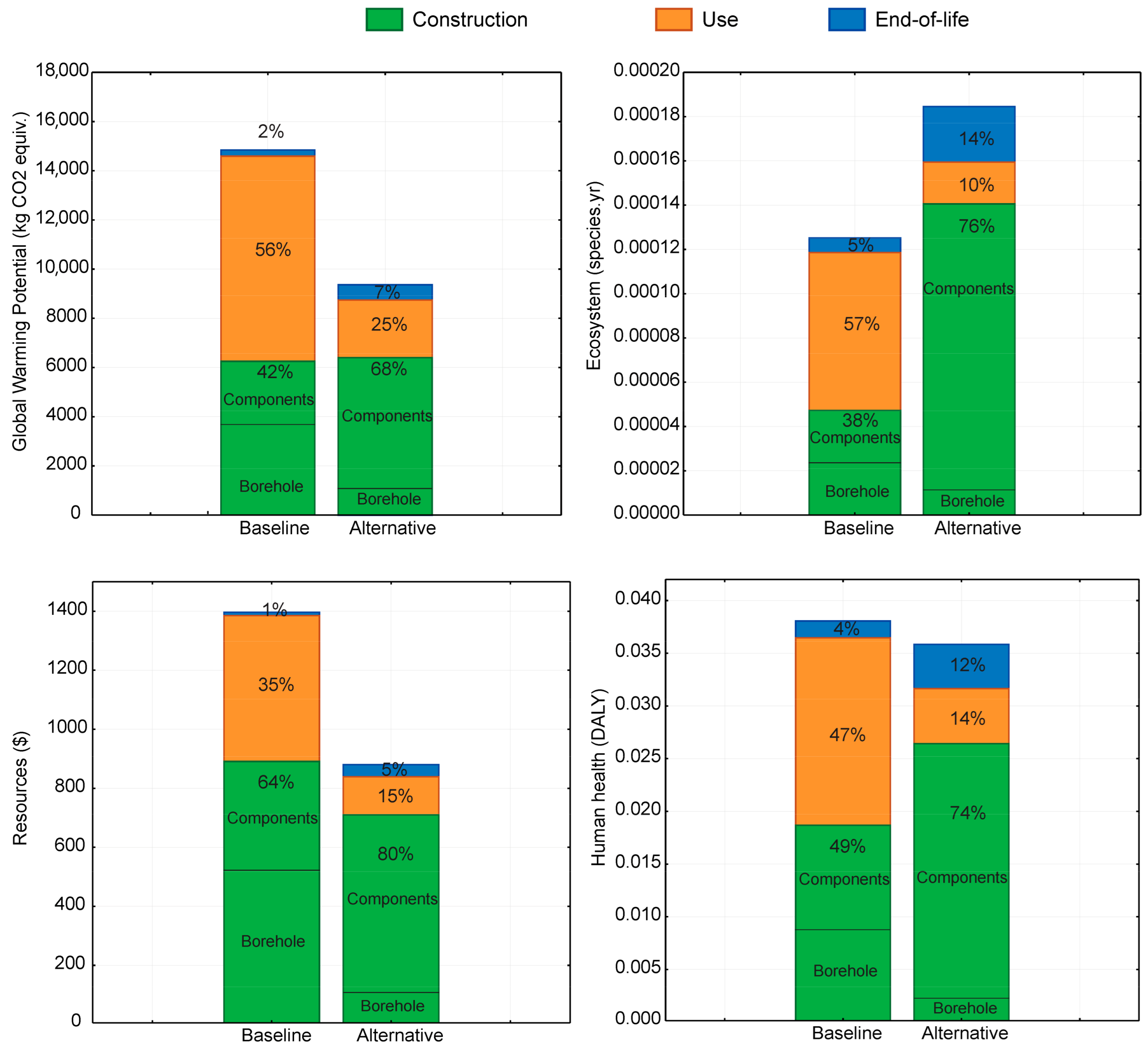 24] conducted a holistic sustainability assessment comparing solar ground-source heat pump (SGSHP) system with conventional GSHP system. Their study integrated LCA, with focus on carbon emissions analysis, and energy analysis to benchmark environmental performance. The SGSHP system was found to perform better, particularly in terms of GWP across all life cycle stages, achieving an overall carbon emission reduction of 9.4% compared to the conventional GSHP system.