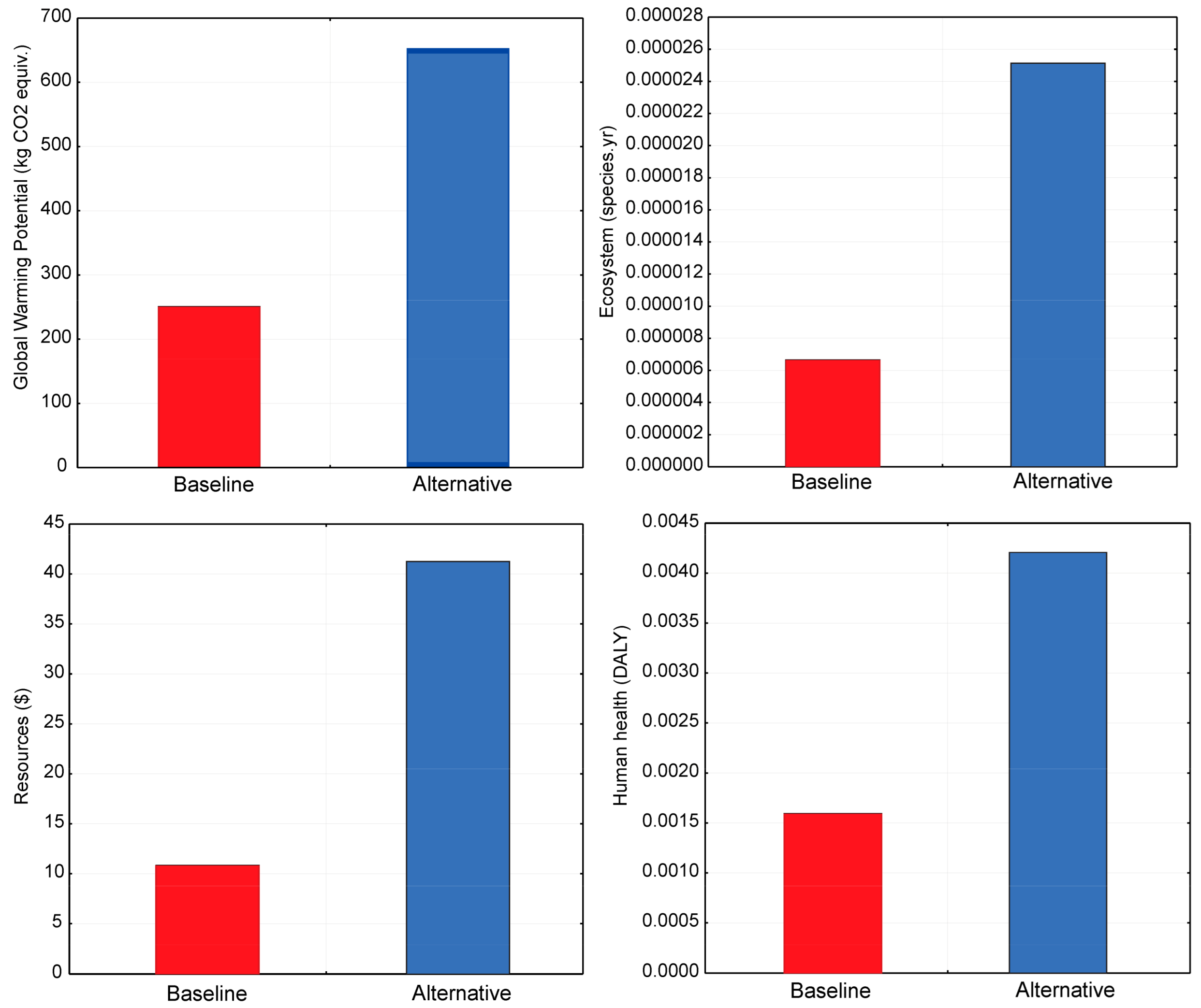 Excess electrical energy generated by PVT and PV systems is typically transferred to the grid, as assumed in this study. Surplus electricity can be stored in batteries and used for charging electric vehicles, among other applications. Looking ahead, emerging technologies are expected to enable the conversion of surplus electricity into hydrogen fuel. Hydrogen could replace fossil fuels in various household uses (such as transportation) or be reconverted into electricity when needed, for example, to support heating, ventilation, and air conditioning (HVAC) systems in buildings. This approach would further advance the decarbonization of the building sector. However, the production and use of hydrogen fuel may also lead to increased environmental impacts in other categories, including Ecosystems, Resources, and Human Health. Therefore, the eco-design of renewable energy technologies will play a crucial role in minimizing these effects.