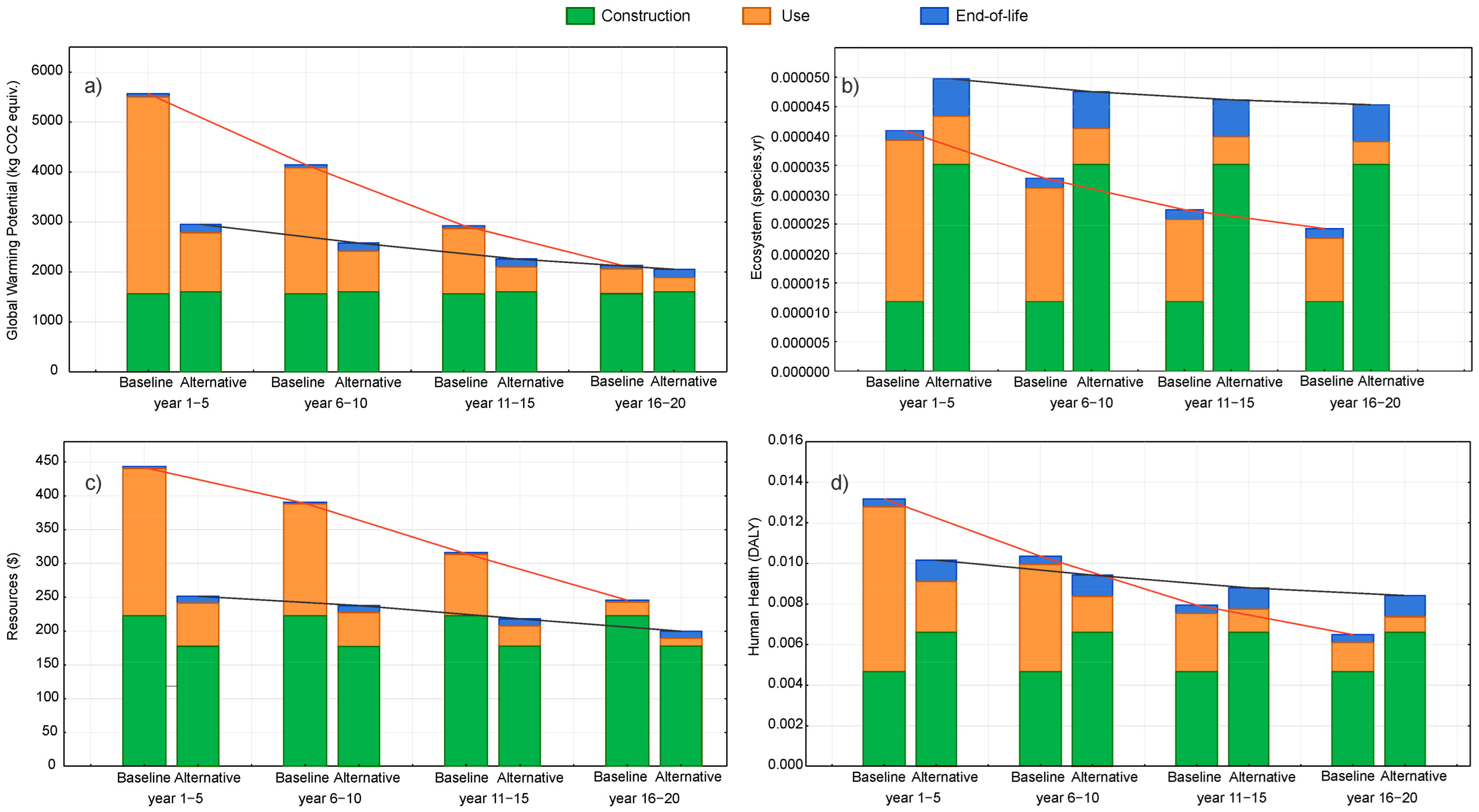 The contrasting trends of reduced GWP and increased Ecosystem impact demonstrate the importance of integrating life-cycle thinking into policy and design practice. For policymakers, the findings suggest that incentives for renewable heating technologies should include criteria addressing embodied impacts and material efficiency to prevent shifting burdens from climate to ecosystems. For building designers, the results indicate the need to select materials and system configurations that minimize ecological damage while maintaining low operational emissions. Balancing these aspects is essential to ensure that future low-carbon heating solutions achieve environmental neutrality across all impact categories.