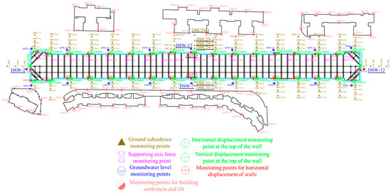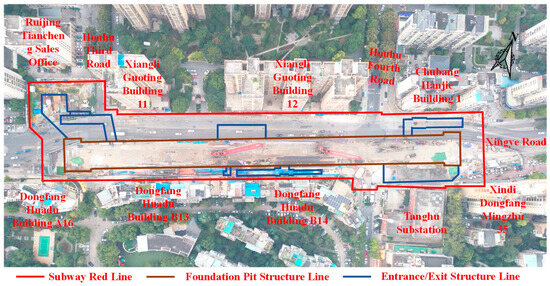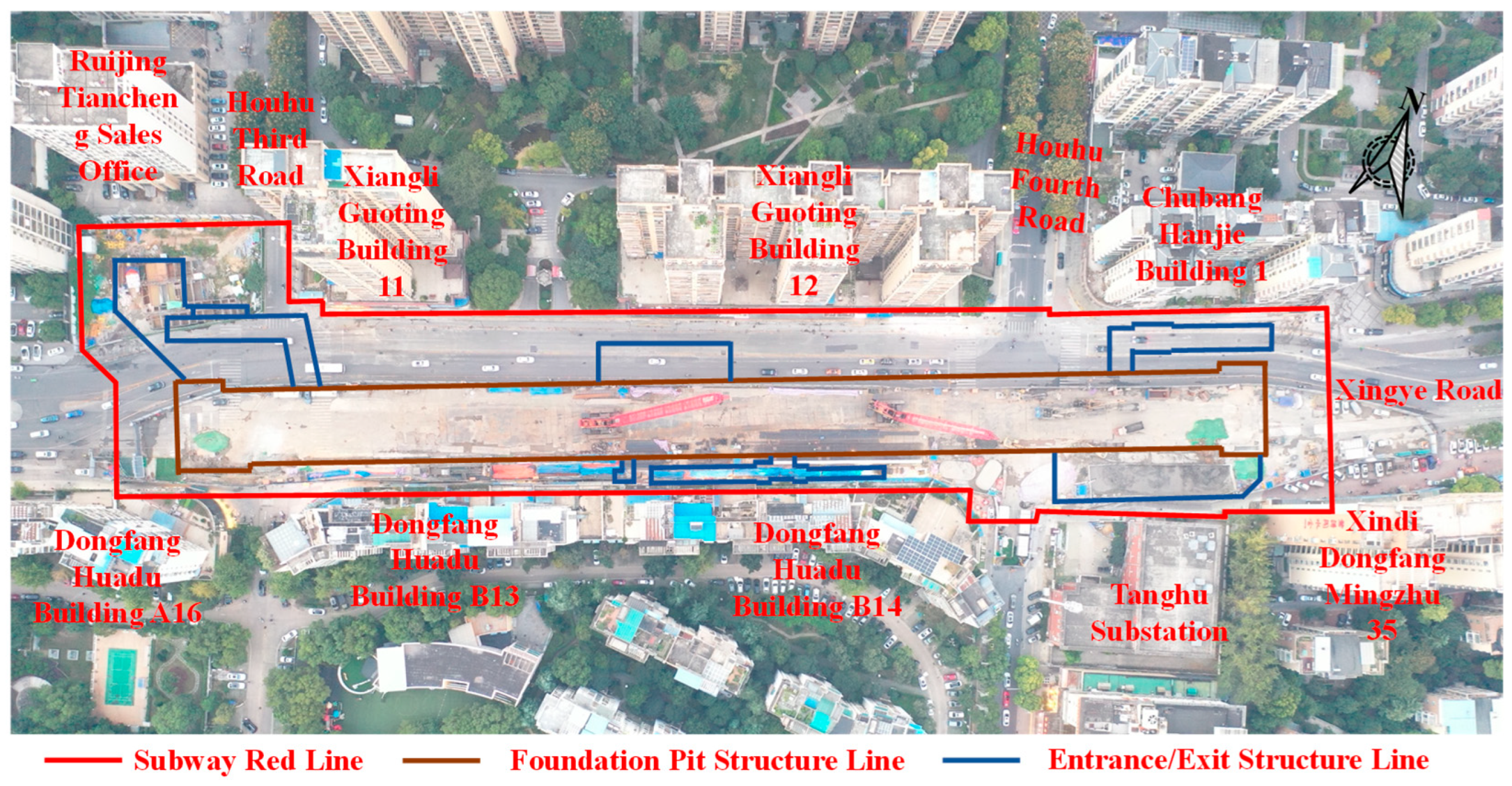 - At the southeast corner, there is Building 35 of Xindi Dongfang Mingzhu, a 16-story frame-shear wall residential building approximately 18.4 m from the main pit. To the south of the deep construction pit, there are Buildings B13 and B14 of Dongfang Huadu, 2-story street-facing commercial shops, and the Tanghu Substation. Buildings B13 and B14 are both 12-story frame-shear wall residential buildings, located about 10.6 m and 10.3 m from the main pit, respectively. The Wuhan Power Supply Bureau’s Tanghu 110 kV substation is a 3-story structure about 24.4 m from the construction pit. At the southwest corner of the station pit, there is Building A16 of Dongfang Huadu, a 12-story frame-shear wall residential building approximately 8.2 m from the main pit.
