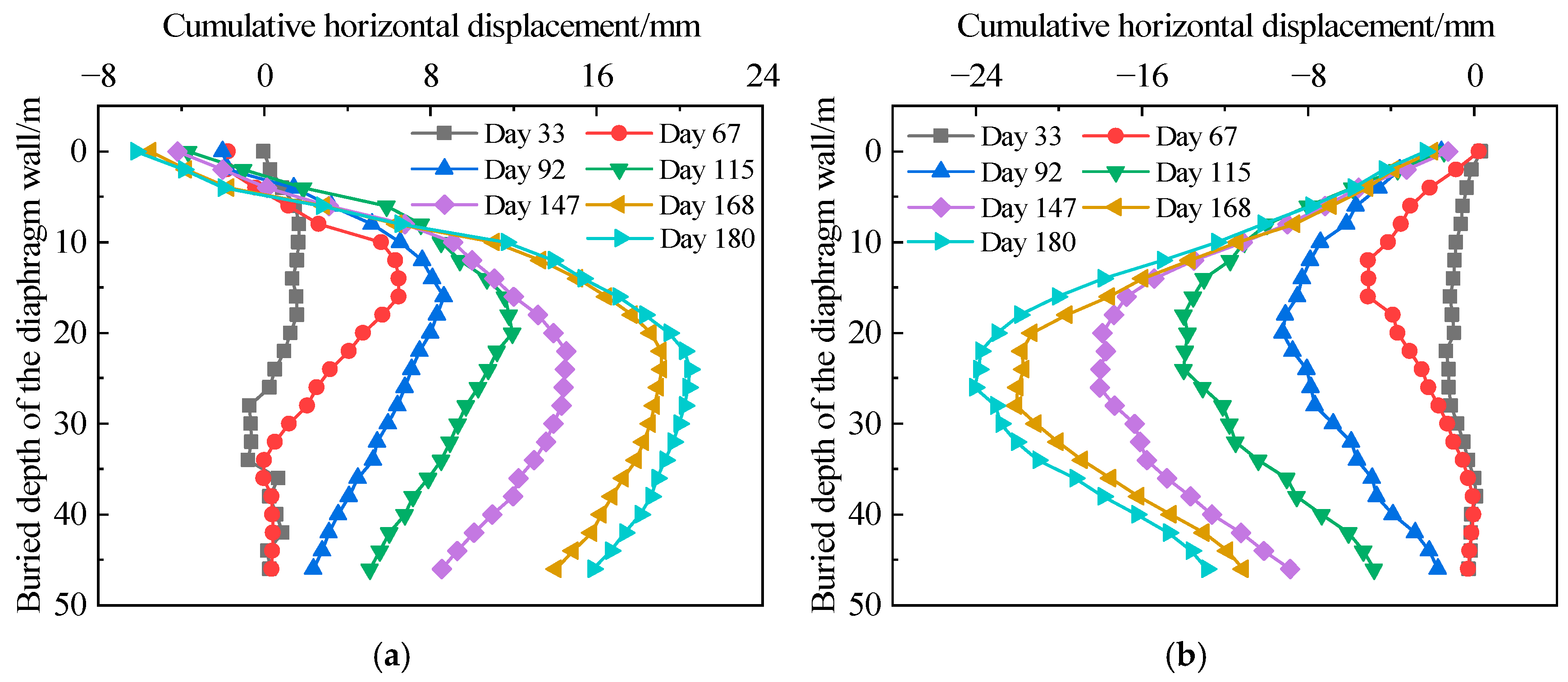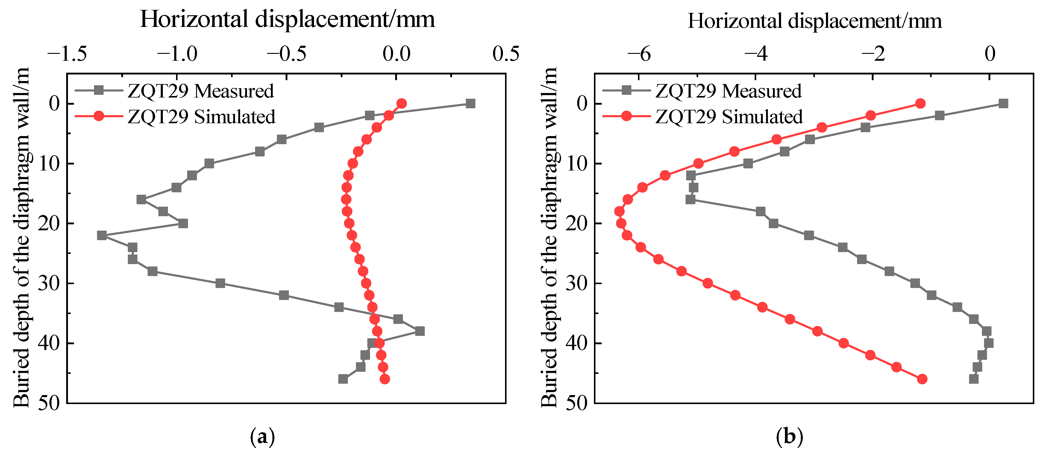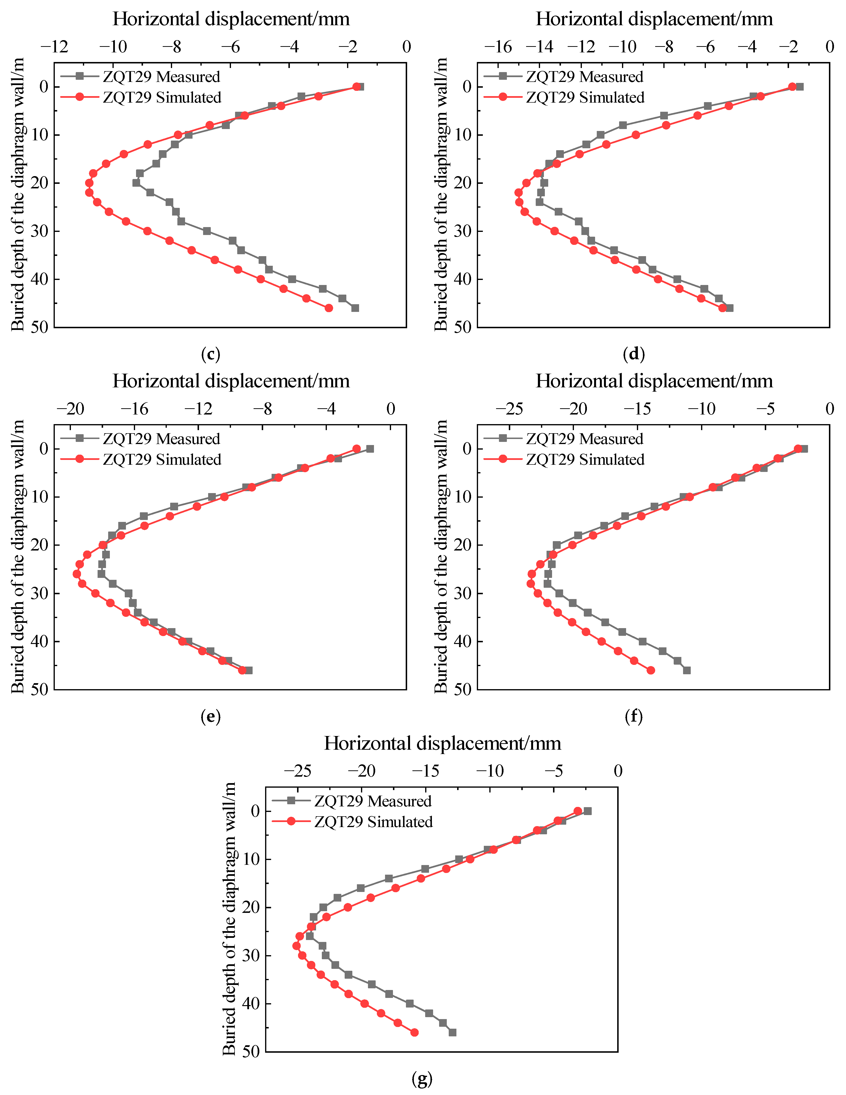 | Construction Day | ZQT11 Maximum Horizontal Displacement (mm) | ZQT11 Depth of Maximum Horizontal Displacement (m) | ZQT29 Maximum Horizontal Displacement (mm) | ZQT29 Depth of Maximum Horizontal Displacement (m) |