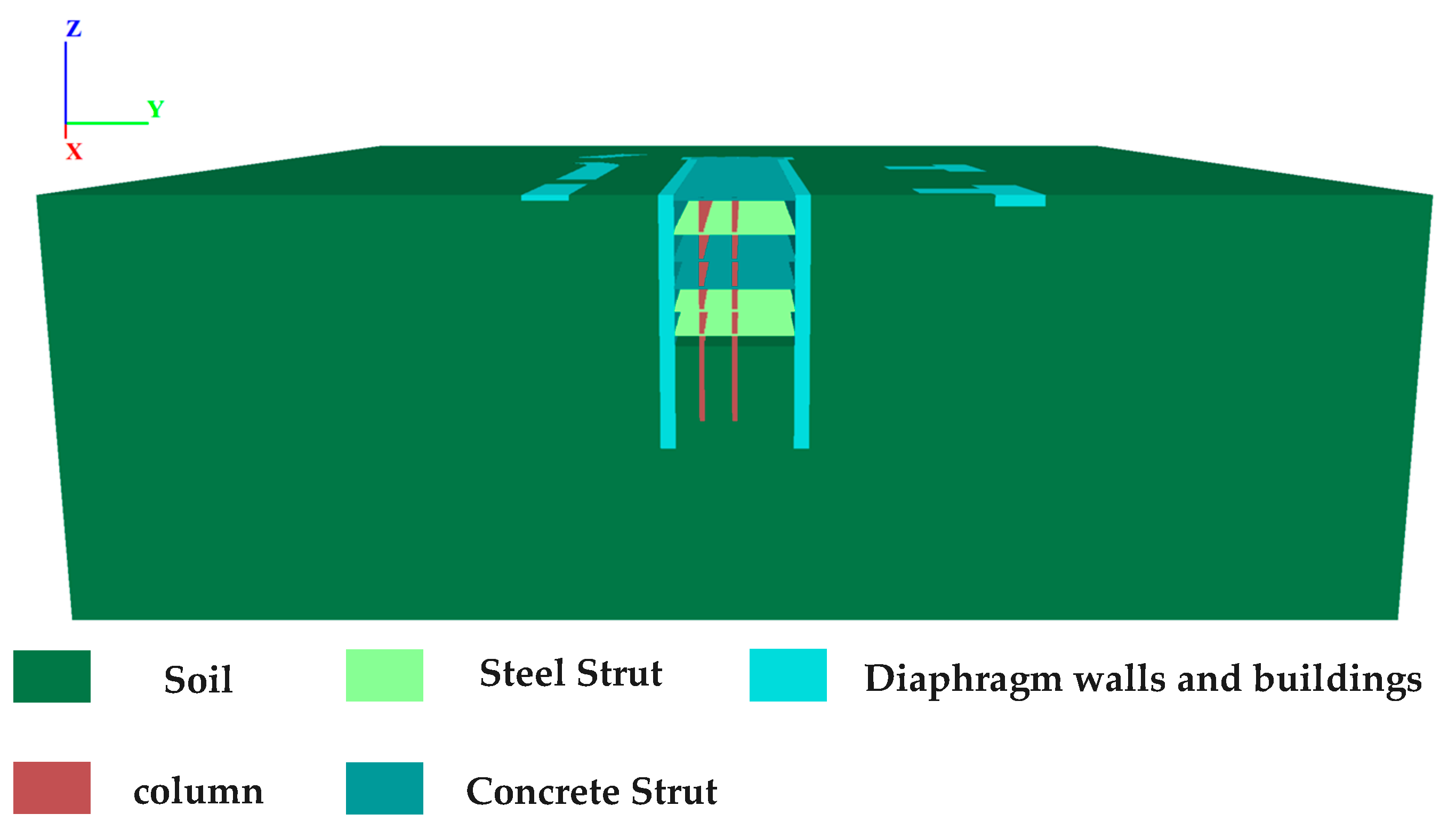 - Establish the model, considering the initial geo-stress equilibrium among adjacent buildings, diaphragm walls, and columns;