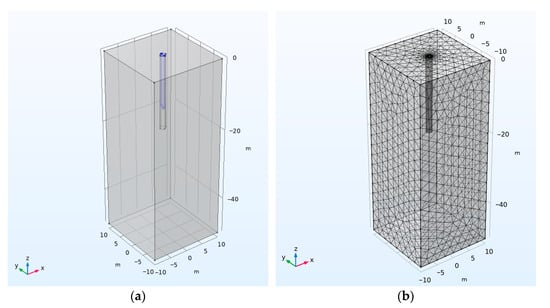 Schematic diagram of pile–soil interface of energy pile model: (a) overall model; and (b) grid division of the model.