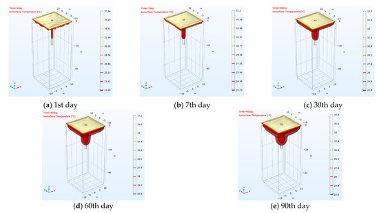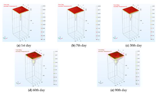 Figure 2 and Figure 3 depict isotherms illustrating the temperature distributions in the pile and soil on the 1st, 7th, 30th, 60th, and 90th days for both summer and winter conditions. The isotherms reveal a progressive stabilization of heat transfer between the energy pile and the surrounding soil. Initially, a significant temperature gradient between the heat exchange tube and the pile results in rapid internal heat transfer. After approximately 7 days, the dominant heat transfer mechanism shifts to external diffusion into the surrounding soil. By the 60th day, thermal equilibrium is nearly achieved, with minimal further changes in temperature distribution.