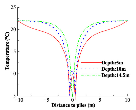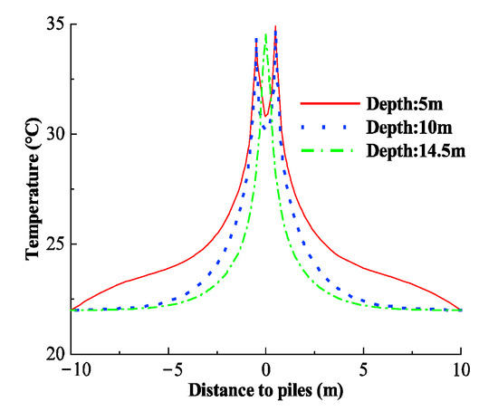 Upon reaching thermal stability (approximately day 60), the temperature distribution in the surrounding soil is examined along the y-axis at various depths. Specifically, cross-sectional temperature profiles are extracted along the y–z plane (x = 0) at depths z = 14.5 m, z = 10 m, and z = 5 m, corresponding to the bottom of the heat exchange tube, mid-depth, and near-surface, respectively. These profiles, presented in Figure 4 and Figure 5 for summer and winter, respectively, illustrate the vertical variation in soil temperature during the stable phase.