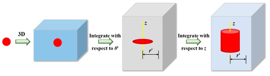 A solid cylindrical heat source can be conceptualized as an assembly of numerous ring-shaped heat sources distributed along its height. To formulate the instantaneous ring-shaped heat source model, we treat it as the integration of instantaneous point heat source models over a ring of radius r′ at time t′. In cylindrical coordinates, assuming the heat generation of the ring source is qdr′dz′, the instantaneous ring-shaped heat source model is derived by integrating the point heat source model over the angular coordinate θ′. This integration yields the following expression: