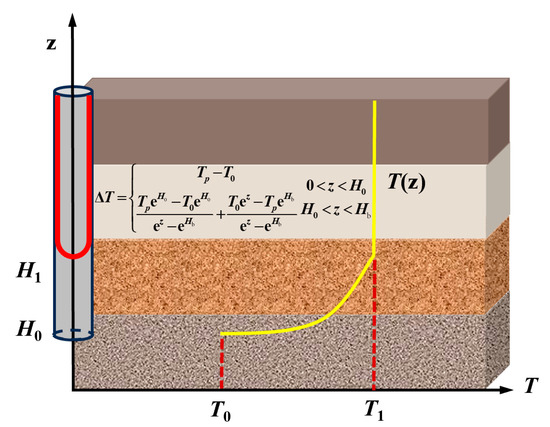 The temperature at the pile–soil interface of an energy pile reaches stabilization within approximately 7 days. In the analytical solution for the temperature field, heat transfer within the pile is neglected, and the interface temperature is assumed to equal the internal temperature of the energy pile. The embedded portion of the heat exchange tube within the pile is modeled as a cylindrical heat source with a uniform temperature, corresponding to the fluid temperature inside the tube. For depths below the installation depth of the heat exchange tube, the interface temperature is determined using Equation (4). To model the temperature variation along the energy pile, the embedded heat exchanger is divided into two segments at depth H0: above H0, the heat source is treated as constant with a uniform temperature equal to that of the fluid; below H0 to the pile base, it is treated as a variable temperature heat source. The resulting temperature profile of the energy pile is illustrated in Figure 8 and mathematically expressed by Equation (10).