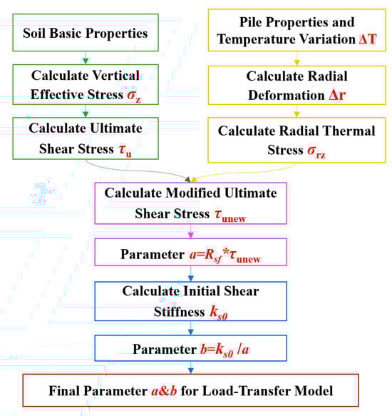 In this mechanical model, a and b are parameters influenced by temperature variations in energy piles. In the load transfer model for conventional pile foundations, which uses an exponential function, a represents the pile–soil interface failure shear stress, while b is the ratio of the initial shear stiffness to the failure shear stress. For energy piles specifically, these parameters can be expressed as: