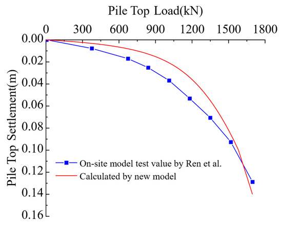 In the vicinity of the energy piles, the soil primarily consists of silt and silty clay, with the Poisson’s ratio of each soil layer assumed to be 0.3. The load-settlement curves of the energy piles, derived using the method proposed in this study, were compared with results from on-site model tests conducted by Ren et al. [32], as shown in Figure 14. The close agreement between the load-settlement curves obtained from our method and those from Ren et al.’s [32] field tests, as observed in Figure 14, demonstrates that the proposed load-settlement calculation method effectively and accurately captures the load-settlement behavior of energy piles under temperature variations.