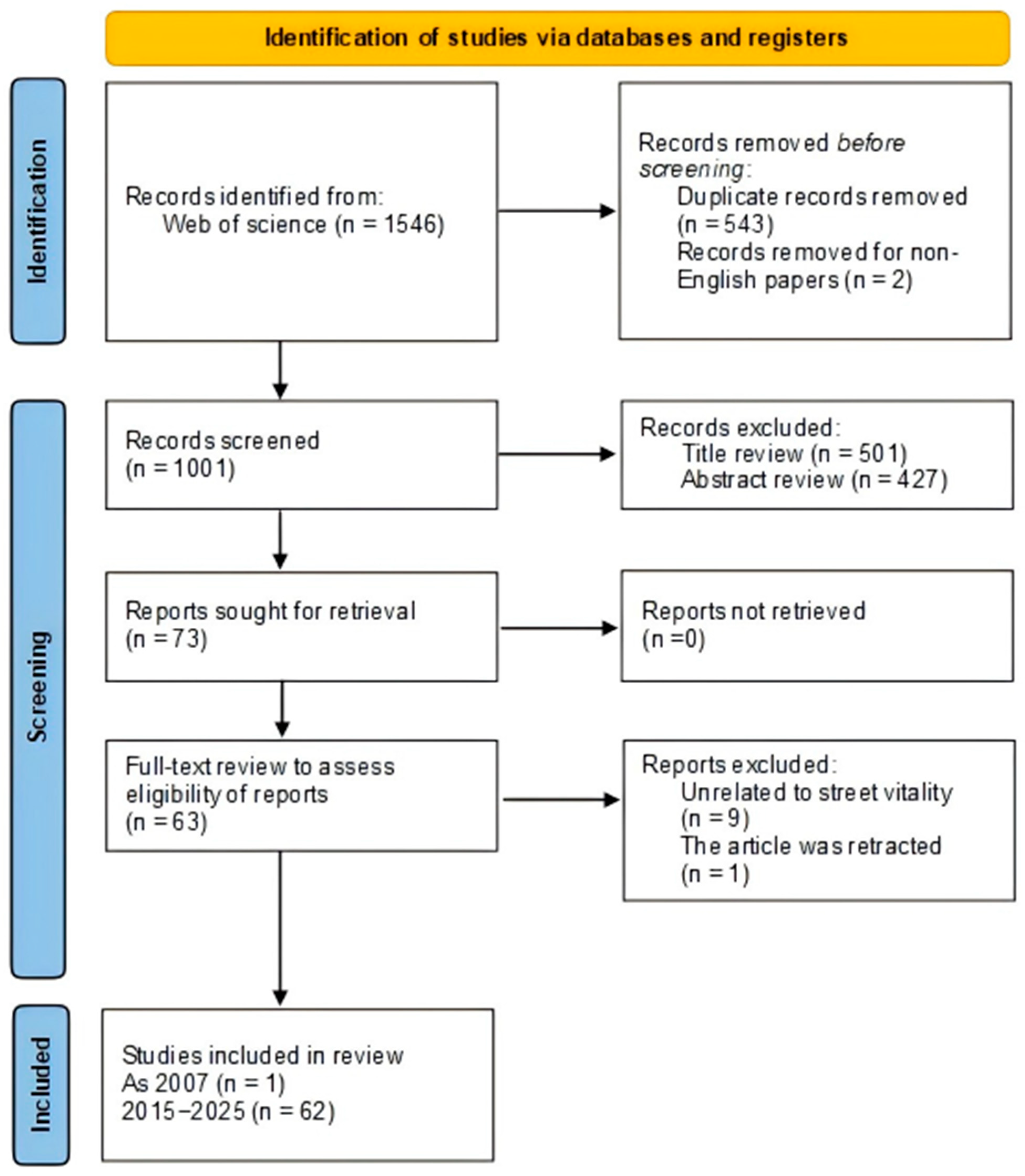 - Abstract Review: Papers were further filtered based on contextual relevance (e.g., walkability, vibrancy, urban, street), narrowing the selection to 73 papers.