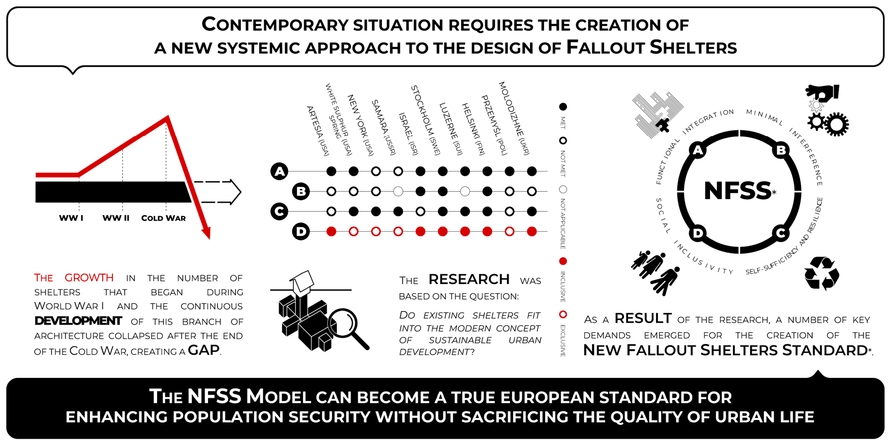 In view of the increasing risk of military conflict on the European continent, it becomes necessary to revise the approach to the design of fallout shelters, particularly in the context of highly urbanised environments. This is particularly the case in the former communist Eastern bloc countries, which do not have an extensive and efficient shelter infrastructure similar to the Scandinavian model. In contrast, the one that exists is characterised by poor technical condition and lack of integration into the modern and vibrant urban fabric. This state of affairs generates a research gap indicating a lack of contemporary model solutions for Central European shelters. This is followed by the thesis of this paper, which states that the contemporary situation requires the creation of a new systemic approach to the design of fallout shelters integrated into the city centre fabric and able to function as part of sustainable urban development. This thesis meets the current empirical observation that the design community has still not developed standards for responding to military threats in an urban structure. This applies both to spatial solutions themselves and to procedures for implementation, location and integration with urban infrastructure. The aim of this thesis is, therefore, to develop a set of practical design recommendations based on case studies that could provide a starting point for the development of the New Fallout Shelter Standard (NFSS) for urban shelters as a sustainable civil resilience infrastructure in the 21st century.