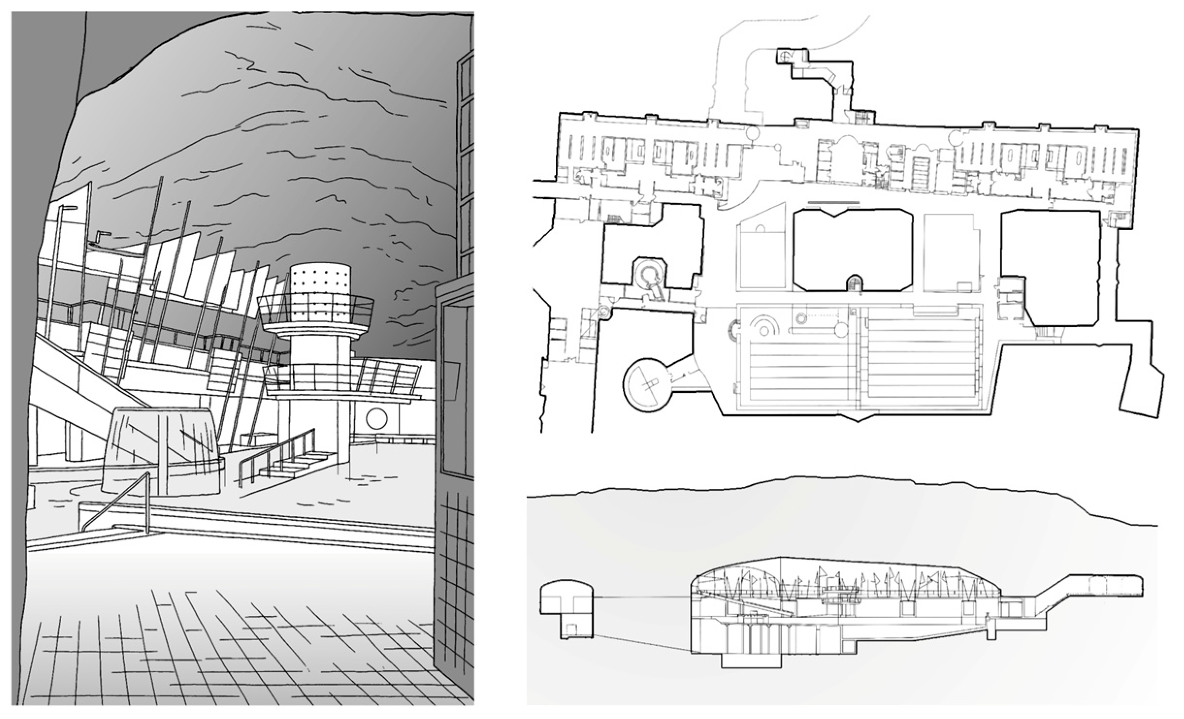 Sonnenberg tunnel shelter, Lucerne, Switzerland. Visualisation of interior, plan, section and general scheme. Source: compiled by the authors.