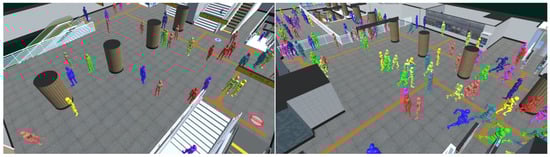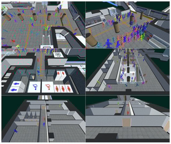 To implement this, the 3D model of Dongsu Station was modified with intentional irrational destinations, such as restrooms and blocked corridors. Agents arriving at these points were programmed to follow a “stop–search–redirect” sequence. After failing to find an exit, they resumed movement toward available exits.