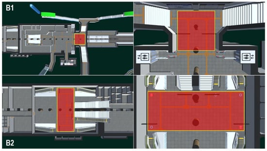 Zhu et al. [] reported that social influence can reduce correct route choice by about 30%. Since this reflects extreme laboratory conditions, we adopted a conservative value of 15% for initial mis-selections, balancing realism with environmental constraints. Figure 3 shows the conceptual sequence for irrational route choice, while Figure 4 identifies the irrational destinations placed within the B1 and B2 levels of Dongsu Station.