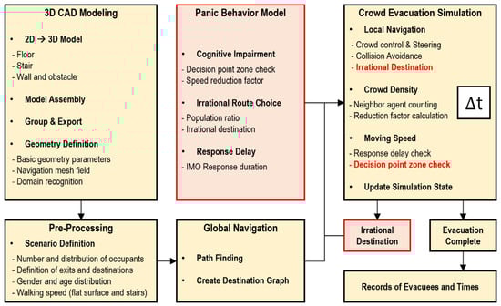 The proposed framework differs from previous models that separately examined individual panic effects. Here, the three interdependent panic behaviors are implemented together to capture their coupled impact on congestion and route deviation in confined subway spaces. The evacuation simulation framework in this study consists of five major modules: 3D CAD modeling, pre-processing, panic behavior model, global navigation, and crowd evacuation simulation. The system operates at the individual agent level and iterates in a loop until all agents complete evacuation. Figure 6 illustrates the overall architecture, including the integrated panic behavior module.