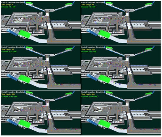 In the baseline scenario (without panic behaviors), all agents followed normal route selection and walking speeds. No reaction delays, irrational routes, or hesitation at intersections were included. Figure 7 shows the baseline simulation results, which serve as a reference for comparison.