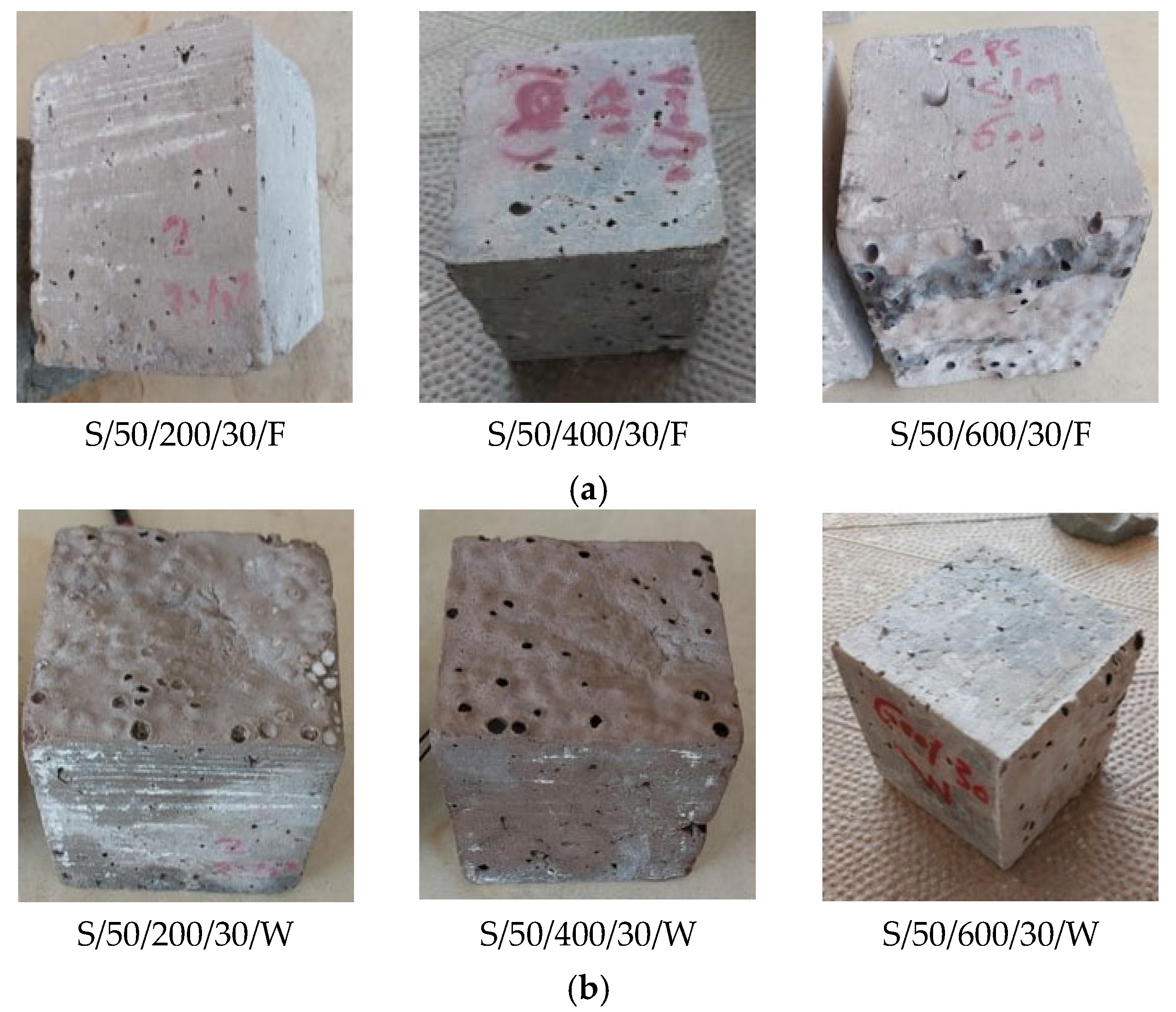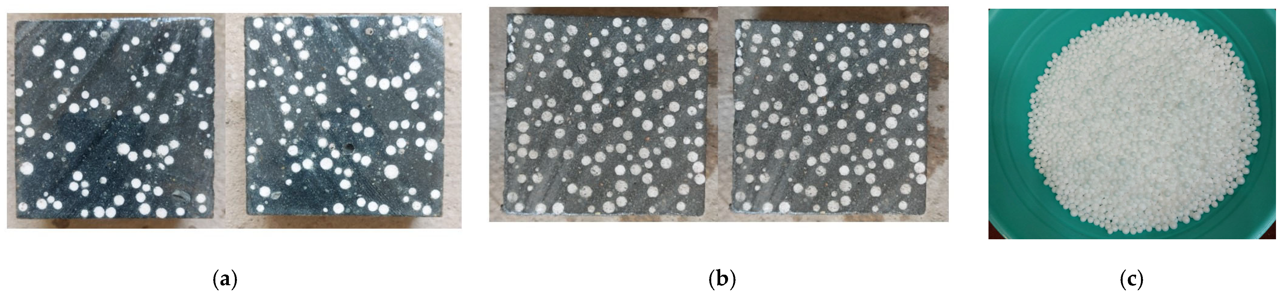 - Lightweight Alkali-Activated Mixture (LWAS): This mixture was derived from the HSAAM formulation but incorporated EPS beads as a partial volumetric replacement (50%) for the natural sand. The objective was to evaluate the efficacy of EPS in simultaneously reducing density and mitigating explosive spalling within an alkali-activated matrix.