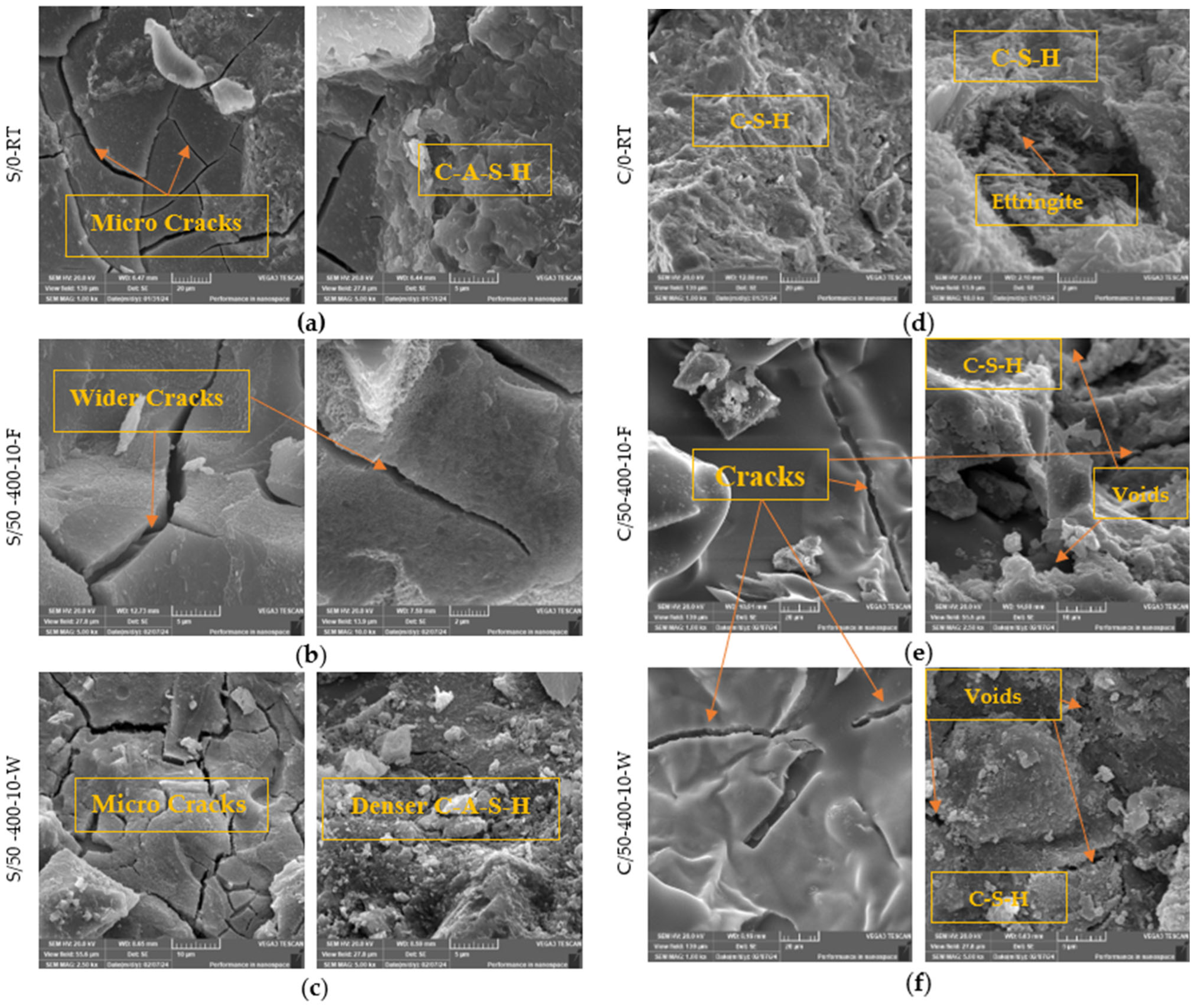 - Mechanical Performance Divergence: The stability of the C-A-S-H gel in S/50 explains its more gradual strength loss. Even at 400 °C, the gel structure, while coarsened, is still present and providing some binding force. The cementitious C-S-H gel in C/50, with its inherent thermal instability, undergoes rapid and catastrophic breakdown, leading to swift mechanical degradation even before the point of spalling. The potential for rehydration in water-cooled S/50 (hinted at by the changed ratios) directly correlates with its better retention of compressive strength compared to its furnace-cooled counterpart.