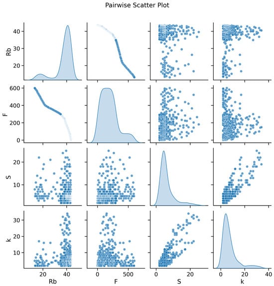 Figure 3 presents the scatterplots. The visualizations of the numerical data located on the main diagonal allow for an analysis of data bias. For the strength column, the data are skewed toward the range of 35 to 45 MPa, for the “Average Damage Area” column, the greatest number of data points are observed in the range of 2 to 7 mm2, and the most frequently occurring value for the number of detected damaged areas is distributed between 2 and 7. When analyzing the scatterplot, it is worth noting that no obvious clusters were detected. A linear relationship is observed between Rb and F. Another valuable insight is the upward trend from left to right for the S and k columns, indicating a positive correlation (which is true, as the average area increases with increasing damage count).