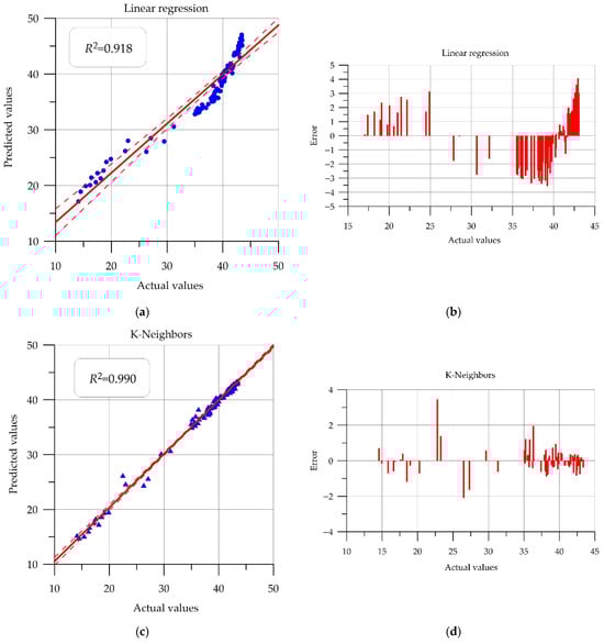 Finding optimal values for the model’s key parameters is a key step in achieving the best generalization. This research employed a grid search with three-box cross-validation to examine all potential parameter combinations for each model. The parameter grid was formed taking into account the small size of the dataset. For example, for the k-nearest neighbors method, this imposes limitations on the choice of the number of neighbors. A large value for this parameter may prevent the model from capturing subtle patterns in the data. For tree-based methods, a small dataset size influences the choice of tree depth (they should not be too deep), as well as the minimum number of samples required to split an internal node of each tree. In this study, the search for the best parameters was carried out on a fixed grid of possible values. In further development of the study, it is planned to apply bisection search and fine-tuning (FT), which will improve the forecasting quality []. During the implementation of the algorithm, reproducibility of results across all model series was ensured, ensuring identical fold partitions. This approach enables subsequent comparison of models using key metrics.