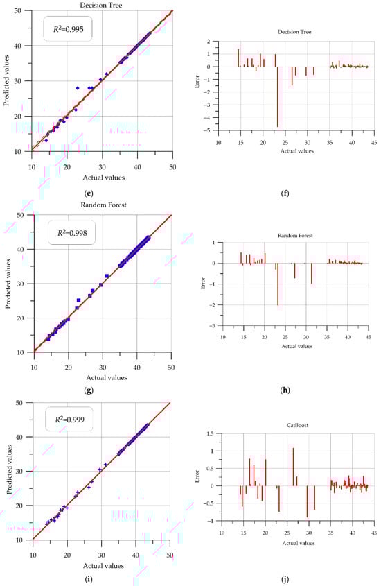 Comparing the obtained results with models already available in the scientific field, it is worth noting that good quality metrics were achieved in the present study. In the study [], the coefficient of determination for the best hybrid models was 0.95–0.97. In the present study, the R2 metric also starts at 0.95 and reaches 1.00. In [], the SVR algorithm demonstrates high accuracy and predictive power with an R2 value of 0.95 and an RMSE of 3.40 MPa. This method also demonstrated positive results in the present study, achieving an R2 value of 1.00 and an RMSE of 0.55 MPa. The decision tree gradient boosting algorithm in [] demonstrated the following forecast errors: MAE 0.1351 MPa, RMSE 0.1842 MPa, and MAPE 0.48%. The CB gradient boosting algorithm in the present work demonstrated comparable results: MAE 0.14 MPa, RMSE 0.25 MPa, and MAPE 0.5%.