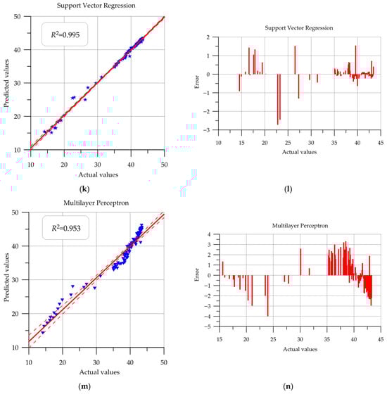In the field of predicting physical and mechanical properties, AI methods can reveal hidden patterns in data sets, providing a high-quality basis for further decision-making [,,,,,]. High efficiency (coefficient of determination (R2) was equal 0.99 for predicted and actual values) has been achieved in predicting the self-compacting concrete compressive strength using artificial neural networks []. The compressive strength of concrete was predicted using machine learning algorithms based on CatBoost gradient boosting, k-nearest neighbors, and support vector regression. The best model demonstrated the following values of quality metrics: MAE = 1.97, MSE = 6.85, RMSE = 2.62, MAPE = 6.15, determination coefficient R2 = 0.99 []. Prediction of the strength properties of concrete with different additives is also possible using AI [,,]. For example, the strength of fly ash-based concrete was determined using a fully connected ANN, a convolutional neural network and a hybrid model, as well as several transform models. The determination coefficient for the best models ranged from 0.95 to 0.97 []. Several machine learning algorithms were used to ascertain the strength of concrete with waste glass powder: linear regression (LR), K-nearest neighbors regressor (KNN), ElasticNet regression (ENR), decision tree regressor (DT), random forest regressor (RF) and support vector regressor (SVR). With an R2 of 0.95 and an RMSE of 3.40 MPa [], SVR displayed superior accuracy and predictive performance compared to the other algorithms examined.