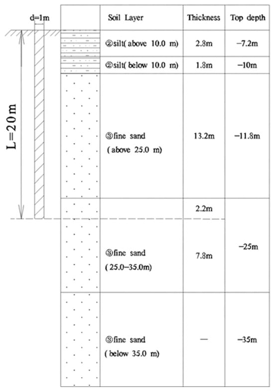 Given the local stratigraphy and foundation soil properties, reinforced-concrete bored cast-in-place piles (C50 concrete) were adopted. The design pile diameter is 1.0 m, and the nominal length is 20 m. The intended bearing horizon is a fine-sand stratum at approximately 25.0–35.0 m depth (see Figure 1).