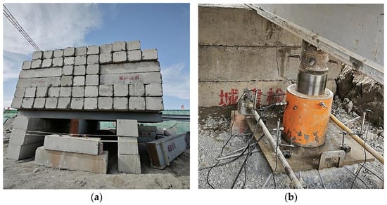 Static load tests can faithfully reflect the bearing behavior of pile foundations under pile–soil interaction, identify failure modes, and reveal anomalous bearing behaviors under special geological conditions, serving as a critical basis for verifying the reliability of finite element models. Therefore, slow-load static tests were conducted in this study in strict accordance with the Technical Code for Testing of Building Foundation Piles (JGJ106–2014) [26]. A counterweight platform reaction device was employed, utilizing stacked concrete blocks to provide the required reaction force (see Figure 2a). Graded loading was applied using a hydraulic jack, with its centerline aligned precisely with the centroid of the pile cross-section. The applied load was indirectly measured by monitoring the oil pressure using a sensor integrated into the hydraulic circuit of the jack.