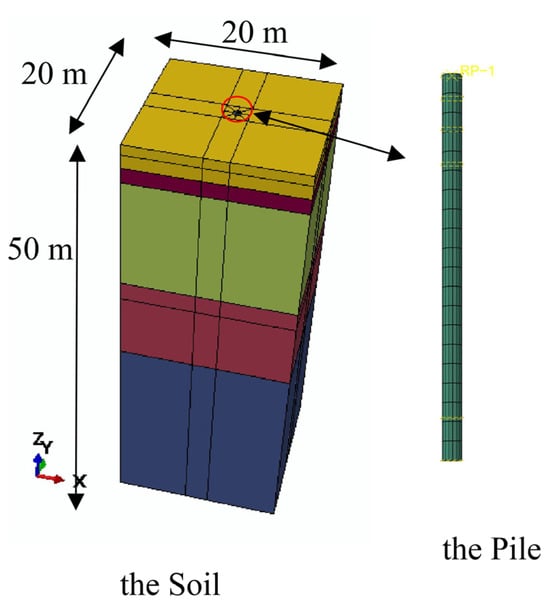 The model integrates two components into a unified system: the pile (Part 1) and the surrounding soil (Part 2). The soil stratum beneath the pile tip was assigned a thickness of 1.5 times the pile length, while the lateral extent of the soil domain around the pile was defined as 20 times the pile diameter [24,28]. The overall dimensions of the model were 20 m × 20 m in plan and 50 m in height. These dimensions were selected to fully capture the influence zone of pile–soil interaction and minimize boundary effects. The pile–soil model is shown in Figure 3.