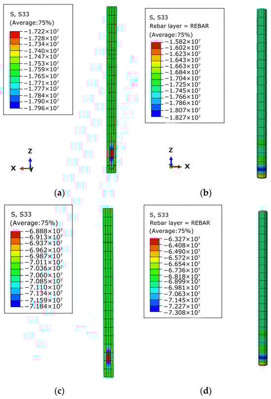 Figure 4. Stress nephograms: (a) Stress distribution in the equivalent model at a settlement of 1 cm; (b) Stress distribution in the reinforced concrete model at a settlement of 1 cm; (c) Stress distribution in the equivalent model at a settlement of 4 cm; (d) Stress distribution in the reinforced concrete model at a settlement of 4 cm.