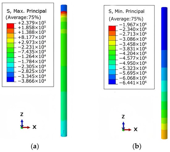 Figure 5. Nephogram of pile–soil friction coefficient analysis (stress unit: Pa): (a) the maximum compressive stress; (b) the minimum compressive stress.