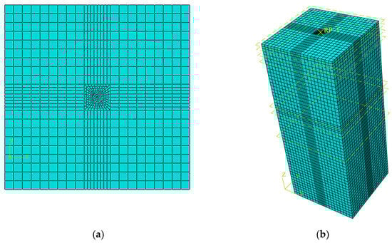The mesh configuration is illustrated in Figure 6. The model was discretized using partitioning and structured meshing techniques for both the pile and surrounding soil, employing optimized C3D8R elements. This study adopted a refined strategy similar to that of Mohsen Bagheri et al. [39] for mesh generation and calibration, implementing local refinement in soil regions around the pile tip and along the pile shaft following the principle of “denser mesh on master surfaces and coarser mesh on slave surfaces.” Specifically, an element size of 0.4 was adopted for the pile cross-section, 0.1 for adjacent soil domains, and 1.0 for remaining regions, resulting in a mesh comprising 42,580 nonlinear solid elements (C3D8R).