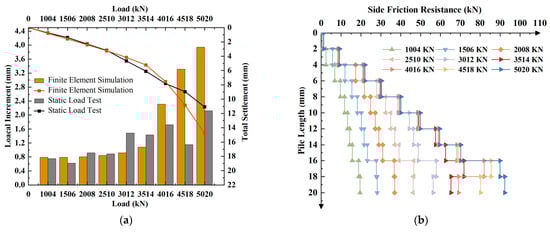 Figure 7. (a) Comparison of settlement; (b) Distribution of pile side friction resistance.
