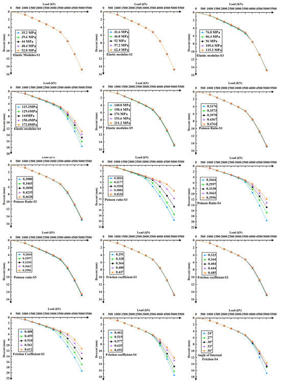Preliminary load–settlement comparisons are summarized in Table 5. Except for S4 (pile-end soil), reductions in internal friction angles for S1, S2, S3, and S5 produced negligible changes in settlement at all load levels. Based on the above analysis results, the number of parameters carried forward was reduced from 19 to 15. Results of the refined tests are presented in Figure 8.