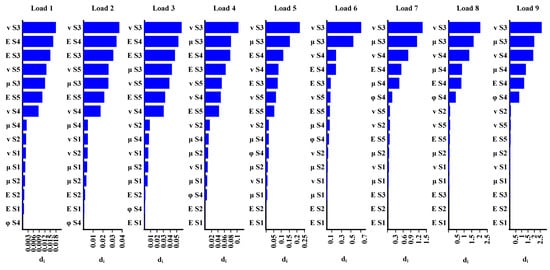 The di values (Figure 6) allow for a visual assessment of how factor sensitivity evolves with increasing load, providing a clear and preliminary understanding of the varying influence of different parameters on settlement under different loading conditions. Based on the criterion of maximum mean di value, the most sensitive factors significantly affecting settlement at each load level were identified.