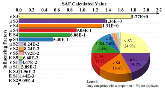The larger SAF, the more sensitivity. the evaluation index A is to the factor F. To more intuitively illustrate the sensitivity of the physical–mechanical properties of each soil stratum to settlement, the mean sensitivity coefficients of each parameter are presented using a combined bar and pie chart (Figure 10). Under the condition of variable control experiments, sensitivity analysis was conducted for the above 15 selected parameters using settlement as the evaluation index. The results show the sensitivity ranking of mechanical parameters of each soil stratum in sandy soil areas with respect to settlement was as follows: v-S3, μ-S3, v-S4, μ-S4, E-S4, and φ-S4.
