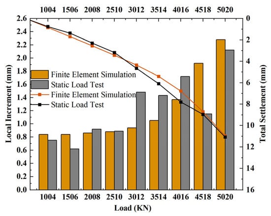 As shown in Figure 2b, pile settlement was quantified using four displacement transducers mounted symmetrically along two orthogonal directions at the pile head. According to the code requirements, the total test load must reach at least twice the design characteristic value of the single-pile bearing capacity—corresponding to a minimum value of 5020 kN in this experiment. The loading process was carried out in 9 stages using the slow-load technique. Each load increment was equal to one-tenth of the maximum test load, with the initial load set at twice the incremental value. Subsequent load levels were applied only after the pile foundation had stabilized under the previous load. Settlement readings were recorded at 5 min after load application within the first hour, followed by readings at 15-min intervals. Beyond one hour, measurements were taken every 30 min. The settlement was considered stable when the rate did not exceed 0.1 mm within one hour, and this condition was met for two consecutive readings. At that point, the criterion for relative stability was deemed satisfied. soils, thereby reducing simulation fidelity [27].