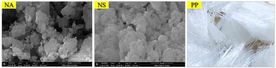 The cement utilized was P.O 42.5 ordinary Portland cement, and its chemical components are shown in Table 1, conforming to the Chinese standard GB175-2007 [] (equivalent to ISO 679:2009) []. Both river sands and crushed stones were produced in Baiyin City, Gansu Province, and their strength, particle size, and gradation satisfied the Chinese standard JGJ 52-2006 [] (equivalent to ISO 6274:1982) []. The river sands were a particle size of smaller than 4.75 mm, with an apparent density of 2.69 g/cm3 and mud content of 1.0%. The crushed stones were a size range 5–20 mm, with an apparent density of 2.85 g/cm3 and mud content of 0.6%. Polycarboxylate superplasticizer with a water-reducing rate of 25% was utilized. Figure 1 shows the modified materials, NA, NS, and PP, which were used to replace a small amount of cement in concrete. NA and NS were produced by Suzhou Yuante New Material Co., Ltd. in Suzhou, China, and their physical properties are shown in Table 2. Polypropylene fiber (PP) is a synthetic fiber spun from isometric polypropylene that has a simple manufacturing process and is very cheap, produced by Changsha Ningxiang Building Materials Co., Ltd. in Changsha, China, with a length of 12 mm.