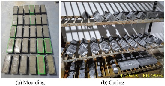 According to the concrete mix proportions, the mixed concrete mixture is poured into molds of two sizes: 100 × 100 × 100 mm3 and 100 × 100 × 400 mm3, forming cubic and prismatic specimens, respectively. The 100 × 100 × 100 mm3 specimens are used for compressive strength tests and CT scan tests, while the 100 × 100 × 400 mm3 specimens are used for mass loss and dynamic elastic modulus measurements in frost resistance durability tests. The specimens were demolded 12 h after pouring, and then all specimens were placed in a curing chamber with a temperature of 20 ± 2 °C and a relative humidity of over 95% for curing. After 24 days of curing, all specimens were taken out and soaked in water for 4 days (Figure 2).
