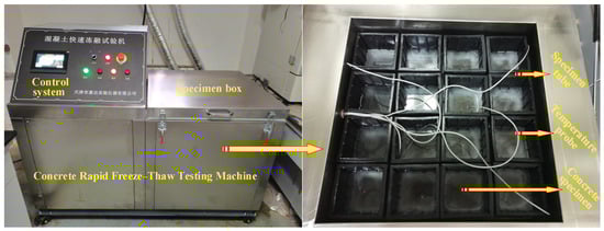 According to the Chinese National Standard GB/T 50082-2009 [] (equivalent to ISO 4845-1:2018) [], the rapid freezing–thawing method is adopted for evaluating concrete frost resistance durability. As shown in Figure 3, the test employs a concrete rapid freezing–thawing testing machine (Tianjin Huida Experimental Instrument Co., Ltd., Tianjin, China), primarily composed of a control system and test specimen chamber. The chamber is equipped with 16 specimen containers, including one fitted with a core temperature probe to monitor the concrete specimens’ center temperature, while three chamber temperature probes are installed at diagonal and central positions to monitor the antifreeze solution temperature within the chamber. The test involves 300 freeze–thaw cycles (approximately 4 h per cycle), with specimen center temperature controlled between −18 °C ± 2 °C during the 2.5-h freezing phase and 5 °C ± 2 °C during the 1.5-h thawing phase.