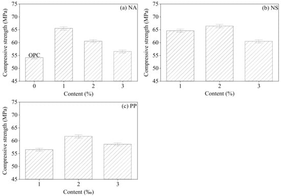 Compressive strength of the modified concrete: (a) NA; (b) NS; (c) PP.