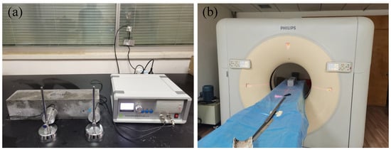 During the rapid freeze–thaw cycling of concrete, the mass, dynamic elastic modulus, and compressive strength of the concrete specimens were tested at different cycle intervals. The specimens tested are 100 mm × 100 mm × 400 mm standard prisms. The mass of the specimen is weighed by an electronic balance. Based on the principle of resonant frequency, the dynamic elastic modulus of the specimen was tested by a dynamic elastic modulus meter (Figure 5a). Based on computed tomography technology, a CT scanner is used to obtain three-dimensional structural information inside the sample non-destructively (Figure 5b).