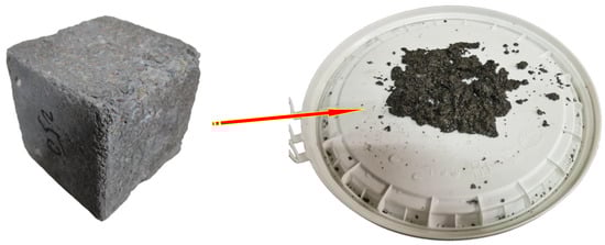 The relationship between the mass of concrete specimens and the number of F–T cycles is shown in Figure 7. During the F–T cycling process, the specimen mass exhibited a decreasing trend with increasing number of cycles, with this trend becoming more pronounced after 100 cycles. The mass loss was attributed to the detachment of fine cement paste particles and sand grains caused by F–T action, with the amount of detachment increasing progressively with continued cycling. As evident from the figure, specimens NA1 and PP2 demonstrated relatively lower mass loss sensitivity to F–T cycles, followed by OPC, while NS2 exhibited the most significant mass loss among all specimens. After 200 F–T cycles, specimen NS2 experienced structural failure due to F–T damage, as illustrated in Figure 8. The failure analysis revealed that the F–T action not only caused surface scaling and spalling but also severely compromised the specimen’s internal microstructure. Notably, NS2’s failure manifested primarily as internal structural damage rather than significant surface particle loss. This suggests that while surface spalling is a visible indicator of freeze–thaw damage, the most critical deterioration occurs internally. In contrast, specimen OPC maintained structural integrity but exhibited rapid mass loss, indicating it was still significantly affected by freeze–thaw cycles despite not reaching complete failure.