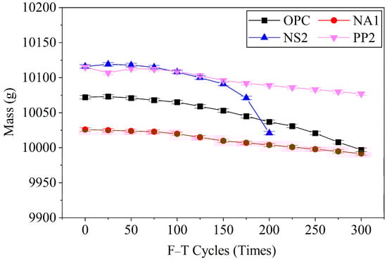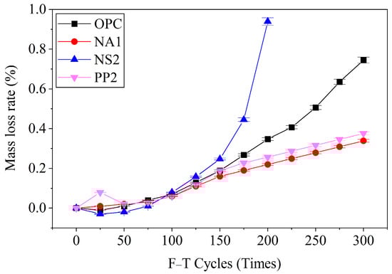 where is mass loss rate of concrete specimens (OPC, NA1, NS2, PP2), %; is initial mass of specimens (OPC, NA1, NS2, PP2) before freeze–thaw cycling, g; is mass (g) of specimens (OPC, NA1, NS2, PP2) after N freeze–thaw cycles, g.