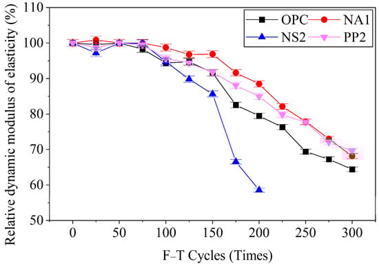 Changes in relative dynamic elastic modulus during F–T cycles (accuracy: ±1%).