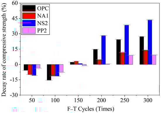where is the compressive strength attenuation rate of specimens OPC, NA1, NS2, and PP2, %; is the compressive strength of specimens OPC, NA1, NS2, and PP2 after N freeze–thaw cycles, MPa; is the initial compressive strength of specimens OPC, NA1, NS2, and PP2 before freeze–thaw cycling, MPa.